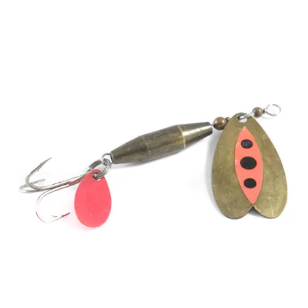 På butterfly-skeden i mässing finns namnen på både tillverkaren och modellen tydligt stämplade, vilket markerar detta som ett genuint stycke fiskehistoria från Pacific Northwest. Denna 10 g (1/3 oz) spinnare har en viktad kropp av solid mässing som ger den nödvändiga ballasten för kast. De dubbla skedarna, med en total längd på 7 cm (2 3/4"), uppvisar ett färgmönster i Mässing / Orange centrerat kring en klarorange rand med tre svarta prickar. På den bakre fjäderringen sitter, tillsammans med trekroken, en liten röd huggbricka, en vanlig syn på många Luhr Jensen-produktioner. Ursprungligen från USA och med produktkod 1608, är betet i ett rent 4/5-skick och behåller sin ursprungliga lyster samtidigt som det visar den subtila mognaden hos ett äldre fynd från fiskelådan.