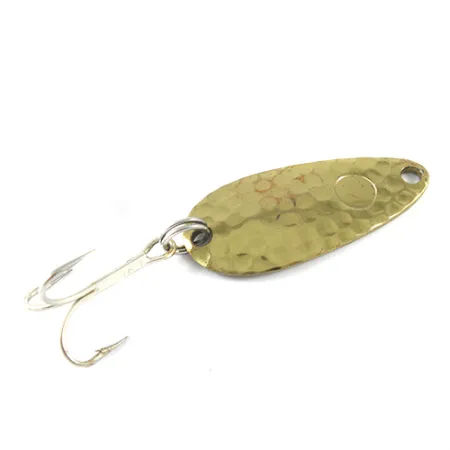 Hamrad guldplätering utgör den främsta visuella lockelsen på detta 4 cm (1 1/2") skeddrag. Med en vikt på 7 g (1/4 oz) har detta exemplar en ikonisk hamrad textur över sin konvexa sida. På den släta baksidan identifierar de tydliga stämplarna "Les Davis Hotrod" och "USA" dess arv, daterat till när Luhr Jensen införlivade varumärket Les Davis i sin katalog. Monteringen består av en robust fjäderring och en silverfärgad trekrok som är intakt. Draget visar tecken på lätt, autentisk användning och håller ett gediget skickbetyg på 3/5. Ett precisionsborrat hål i den avsmalnande änden fungerar som fästpunkt för linan för denna Luhr Jensen-produkt med kod 1671.