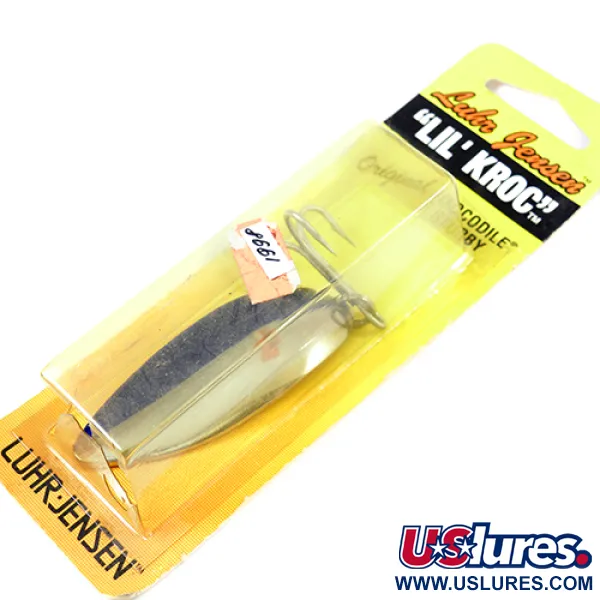 Detta kompakta skeddrag mäter 2 1/2" (6,5 cm) och har en Nickel / Blå finish som kännetecknar "Lil' Kroc"-varianten i Luhr Jensen Krocodile-serien. Med en vikt på 3/4 oz (21 g) har Stubby-modellen en mer kompakt profil än standardmodellerna, utformad för att nå större djup vid kast eller jigging. Detta specifika bete har produktkod 1998 och representerar varumärkets tradition av USA-baserad tillverkning i Hood River, Oregon. Även om den vintage blisterförpackningen på gult kort visar vissa hanteringsspår är själva betet oanvänt. Utrustningen består av en enkel trekrok säkrad med en robust fjäderring, designad för hållbarhet och styrka. Stämplingen på baksidan av metallskeden är synlig genom förpackningen och markerar det som ett äkta "Original Krocodile"-exemplar.