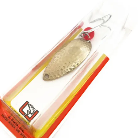 Hamrad nickel skapar en distinkt ljusreflekterande yta på denna Lil' Kroc, en mindre vanlig variant av den legendariska Krocodile-serien från Luhr Jensen. Identifierad av "Krocodile Stubby"-stämpeln på den konkava sidan, representerar detta bete en kortare och tjockare profil jämfört med standardskeddrag, vilket gör att det når djupet effektivt vid kast eller trolling. Med en vikt på 1/2 oz (14 g) och ett mått på 2 1/4" (5,5 cm), har det hållbara komponenter inklusive en kraftig fjäderring och en trekrok parad med en klassisk röd lockskiva. Detta specifika exemplar, katalogiserat under produktkod 9806, är oanvänt, även om originalförpackningen visar visst lagerslitage. Den tjocka metallkonstruktionen ger betydande massa för sin storlek, en egenskap avsedd för kastlängd och stabilitet. Varje stämpel på insidan förblir tydlig och läsbar, vilket visar arvet från Hood River, Oregon hos detta vintagefynd.