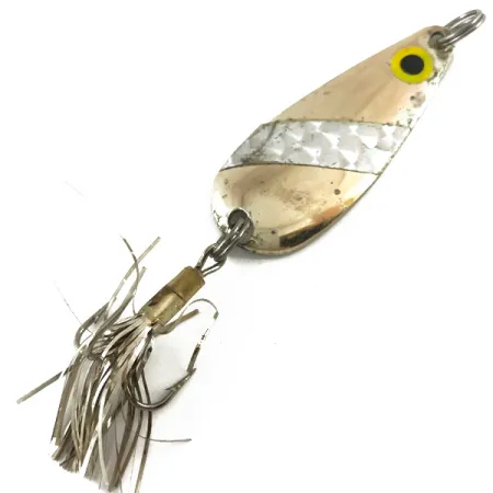 En försilvrad yta över den 5,5 cm (2 1/4") långa kroppen ger den grundläggande lystern åt detta Lindy Finsel skeddrag från Joe's Flies. Modellnamnet är tydligt stämplat på baksidan av skeden, vilket bekräftar dess ursprung som en klassiker i amerikansk sportfiskehistoria. En mönstrad reflekterande tejp med diamantstruktur delar den försilvrade ytan, medan ett målat gult öga med svart pupill sitter nära den övre fjäderringen. Draget väger 10 g (1/3 oz) och är utrustat med en krok klädd i en skimrande silverfärgad tinselkjol. Med produktkod 4497 är detta exemplar i 4/5 skick och har en ren och välbevarad metallfinish. Små märken i ytan på försilvringen speglar dess vintage-resa utan att påverka den strukturella kvaliteten.