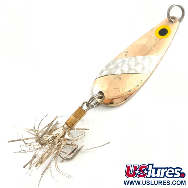 En vikt på 10 g gör denna Lindy Finsel till ett mångsidigt val för en mängd olika sötvattensarter. Guldytan på detta 5,5 cm skeddrag har ett distinkt silverfärgat fjällmönstrat band över mitten, vilket ger en kontrasterande struktur till den reflekterande ytan. Ett framträdande gult öga med svart pupill sitter nära den övre fästpunkten, medan baksidan är tydligt stämplad med namnet Finsel, vilket markerar dess ursprung hos Lindy / Little Joe i USA. Just denna modell, identifierad med produktkod 4527, är utrustad med en silverfärgad tinsel-stjärt på trekroken, vilket ger ett subtilt glitter. Med ett skick på 4/5 visar guldpläteringen lätta tecken på ålder med en mild, autentisk lyster. Konstruktionen avrundas med robusta fjäderringar designade för att tåla trycket från en stark fisk.