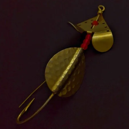 Med sin skimrande yta i hamrad mässing utmärker sig det droppformade huvudbladet omedelbart som en sällsynthet från Lindy / Little Joe. Betet väger 7 g (1/4 oz) och är 7 cm (2 3/4 tum) långt. Skitter-Buzz Weedless har ett specialutformat deltavinklat propellerhuvud med små cirkulära perforeringar i vingarna. Tre transparenta röda pärlor är placerade längs den genomgående vajern och skapar en tydlig fokalpunkt mellan huvudet och den hamrade kroppen. Detta USA-tillverkade bete, med produktkod 24094, är utrustat med en enkelkrok kombinerat med ett vajerskydd speciellt framtaget för fiske i tät vegetation. De guldfärgade metalldelarna är fortfarande blanka och rena, vilket ger detta exemplar ett skickbetyg på 5/5. Det är ett välbevarat ytbete designat för hemtagning i ytan där det roterande huvudet skapar ett spår av turbulens medan den stora hamrade skeden reflekterar ljus underifrån.