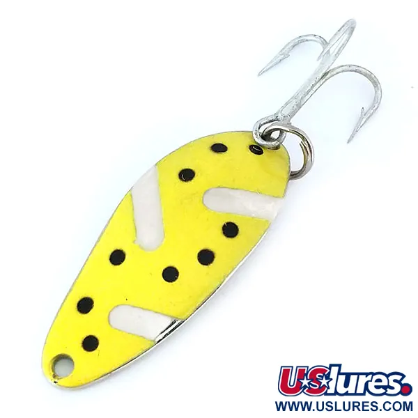 En livlig gul emaljfinish med tydliga svarta prickar karaktäriserar detta Little Cleo, ett klassiskt amerikanskt skeddrag som väger 1/4 oz (7 g). Draget mäter 1 1/2" (4 cm) och uppvisar ett distinkt arv från tiden före Acme med 'SENECA LURE' och 'WIGL-LURE' stämplar djupt präglade på den polerade nickelbaksidan. Detta specifika exemplar, katalogiserat under produktkod 11018, har ett slående mönster av svarta fläckar på ett gult fält, delat av böjda vita ränder som ger visuell kontrast till metallkroppen. Monteringen består av en robust trekrok ansluten till skeden med en kraftig fjäderring av stål. Skicket är klassat som 5/5, där färg- och nickelytor visar utmärkt bevarande från sin ursprungliga produktionsperiod av Seneca i USA.