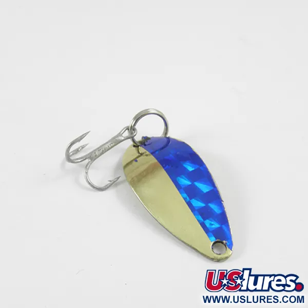 Detta Seneca skeddrag mäter 3 cm (1 1/4") i längd och har en slående hälften-hälften-finish på sin konvexa sida. Ena halvan har en klar guldpläterad lyster, medan den andra är täckt av en livlig blå prismatisk fjälltejp som effektivt fångar ljuset. Denna specifika modell, produktkod 2972, representerar den ursprungliga Seneca-eran av designen innan märket köptes upp av Acme. Baksidan av betet är stämplat med det igenkännbara namnet "LITTLE CLEO" med rena linjer och tydlig text. Med en vikt på 3,5 g (1/8 oz) är skeden dimensionerad för precisionskast med lätta redskap. Komponenterna består av en robust fjäderring och en blank trekrok. I skick 5/5 förblir finishen exceptionellt ren över både guldpläteringen och den blå prismadetaljen.