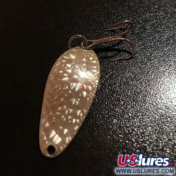 Hamrade fjäll i ett "Crystal"-mönster fångar ljuset över ytan på detta 4 cm (1 1/2") vintage skeddrag. Präglat med den distinkta märkningen "Little Cleo Wigl-Lure A Seneca Lure", representerar detta bete den ursprungliga produktionseran innan märket förvärvades av Acme i början av 1980-talet. Crystal (Golden Scale)-finishen ger en djupt texturerad yta utformad för att efterlikna ljusbrytning på fiskfjäll. Med en vikt på 7 g (1/4 oz) är draget utrustat med sin originalhårdvara och en stark trekrok, vilket visar de klassiska amerikanska tillverkningsstandarderna från perioden. Identifierad med produktkod 11102, är detta exemplar i utmärkt skick och får betyget 5/5 för sin välbevarade finish och skarpa metallstämplingar. Den droppformade kroppsdesignen är viktad specifikt för långdistanskast och trolling.
