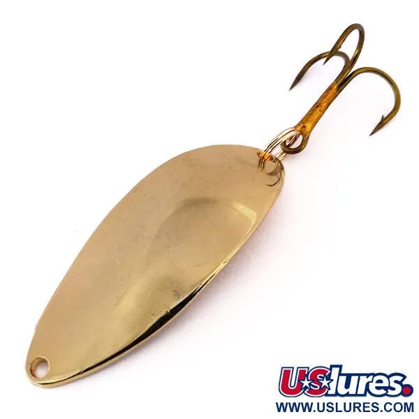 Glänsande i en klassisk guldfinish, utmärker en framträdande Hula Girl-stämpel på baksidan detta exemplar som en mycket eftertraktad tidig produktion från Seneca Lure Company. Skeddraget väger 1/2 oz (14 g), mäter 5,5 cm (2 1/4") och bär produktkod 10303. Många erfarna sportfiskare tillskriver Little Cleos legendariska status till just den där dansargravyren, en detalj som togs bort efter att Acme förvärvade Seneca i början av 1980-talet. Att hitta ett i oanvänt skick, betygsatt 5/5, är en fröjd för dem som uppskattar den ursprungliga "WIGL LURE"-märkningen. Metallen behåller sin ursprungliga lyster och visar de stämplade graferna tydligt mot guldpläteringen. Bestyckningen består av en bronserad trekrok fäst med en kraftig fjäderring i aktern.