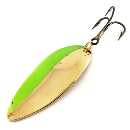 Detta skeddrag, stämplat med vikten 21 g (3/4 oz) på dess polerade konkava guldsida, fångar en specifik era av amerikansk sportfisketillverkning. Den 6,5 cm (2 1/2") långa kroppen har den legendariska "Hula Girl"-gravyren, en detalj som identifierar originalproduktionen från Seneca innan märket förvärvades av Acme i början av 1980-talet. Detta exemplar, med produktkod 13241, uppvisar en slående split-finish på framsidan som kombinerar en högvisuell fluorescerande grön sida med en reflekterande guldhalva. Komponenterna inkluderar en robust guldfärgad fjäderring och en mörkfinishad trekrok som är i gott skick. Samlare söker ofta efter dessa modeller från Seneca-eran specifikt för danslogotypen, som många erfarna sportfiskare anser var en betydande faktor för dragets historiska framgångar. Ytan visar lätta spår av hantering som vittnar om dess ålder, vilket motiverar ett skickbetyg på 4/5. Den djupt stämplade texten och den ikoniska dansarfiguren nära stjärten är fortfarande tydliga och väl definierade.