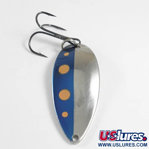 Detta Seneca-tillverkade skeddrag väger rejäla 21g (3/4oz) och har den klassiska finishen Blå / Röd / Nickel med en markerad blå panel prydd av varmtonade prickar. Exemplaret är 6,5 cm (2 1/2") långt, bär produktkod 1745 och är ett utmärkt exempel på den ursprungliga Seneca Lure-designen innan märket köptes upp av Acme i början av 1980-talet. Baksidan är djupt präglad med den berömda "Hula Girl"-dansösen och "WIGL LURE"-märket, en detalj som är mycket eftertraktad av samlare som menar att silhuetten var hemligheten bakom dragets berömmelse. Den polerade nickelytan och originalkrokarna är välbevarade, vilket motsvarar ett skick på 4/5. Den kraftiga metallkroppen är utrustad med en robust trekrok, och både ovansidan och undersidan är tydligt stämplade med vikten och det ikoniska namnet Little Cleo.