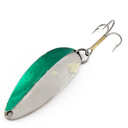 Framsidan av detta 5,5 cm långa skeddrag är uppdelad i nickel och grön metallicfinish, vilket utmärker det som en klassisk Seneca-tillverkning. Denna Little Cleo (HULA GIRL) har den ikoniska dansarstämpeln på baksidan, en detalj högt värderad av samlare som Acme slutade med efter att de köpt varumärket i början av 1980-talet. Baksidan är stämplad med ”WIG-L LURE” och namnet ”LITTLE CLEO” och har bibehållit en polerad lyster. Betet väger 18 g och är utrustat med en trekrok som har ett karaktäristiskt mässingslindat skaft. Detta exemplar, med produktkod 20638, är i skick 4 av 5 och uppvisar ett lätt, ärligt slitage på den grönmålade delen som speglar dess historia. Det tillverkades i USA under en tid då ”Hula Girl” betraktades som en lyckoamulett av sportfiskare över hela landet. Den kraftiga fjäderringen säkerställer att alla delar sitter säkert vid kast.