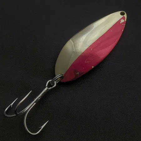 Tydligt stämplat på baksidan av detta 21g (3/4oz) skeddrag finns den ikoniska "Hula Girl"-dansaren, ett kännetecken för originalproduktionen från Seneca Lure Company. Detta specifika exemplar, identifierat med produktkod 21075, representerar eran innan Acme Tackle förvärvade varumärket i början av 1980-talet, varpå dansargrafiken togs bort från produktionen. Draget mäter 6,5 cm (2 1/2") och framsidan har en tvåfärgad finish i guld och rosa-rött. Den målade halvan uppvisar visst autentiskt slitage och mindre färgsläpp som är naturligt för dess ålder, men draget är i utmärkt skick med ett betyg på 5/5. Det är utrustat med en kraftig trekrok med brett gap och en robust fjäderring för en pålitlig koppling vid både kastfiske och trolling. Mässingskroppen har behållit sin metalliska lyster, vilket visar det hantverk som gjorde dessa Seneca-skeddrag till en favorit bland sportfiskare i hela USA.