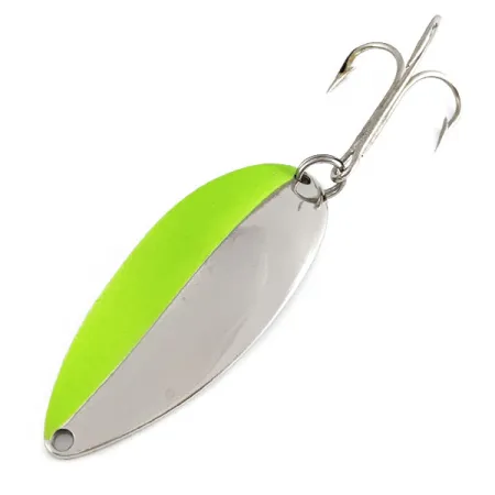 Med en rejäl vikt på 21 g (3/4 oz) uppvisar detta kraftfulla skeddrag för spinnfiske en iögonfallande finish i hälften nickel och hälften neongrönt. Draget mäter 6,5 cm (2 1/2") på längden och har den ikoniska "Hula Girl"-dansösen präglad i nickelytan på den konkava sidan – en signaturdetalj från Seneca Lure Company-eran. Många erfarna sportfiskare svär fortfarande vid just denna "dansar-version", som föregår Acmes uppköp i början av 1980-talet när graveringen till slut togs ur produktion. Detta exemplar, identifierat med produktkod 21764, är i exceptionellt skick och har fått betyget 5/5 för sina blanka ytor och originalkomponenter. Denna USA-tillverkade klassiker har den vikt som krävs för långa kast på djupt vatten där nickelglansen är som mest effektiv.