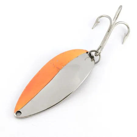 Jämnt delad på mitten fångar finishen i nickel och klarorange på detta Seneca-skeddrag omedelbart blicken. Med sina 6,5 cm (2 1/2") och 21 g (3/4 oz) har detta specifika exemplar den klassiska stämplade dansösen på baksidan – ett kännetecken för originalproduktionen från Seneca Lure Company före Acmes uppköp på 1980-talet. Många erfarna samlare föredrar dessa 'Hula Girl'-varianter, eftersom den ingraverade figuren togs bort i senare produktionsserier. Den polerade metallen förblir i kondition 5/5 och visar inga betydande tecken på slitage på fabriksfinishen. Baksidan av skeddraget är stämplad med produktkod 22112 och anger även tydligt vikt och ursprung. En kraftig trekrok sitter säkert monterad i botten, redo för traditionellt spinnfiske eller trolling.