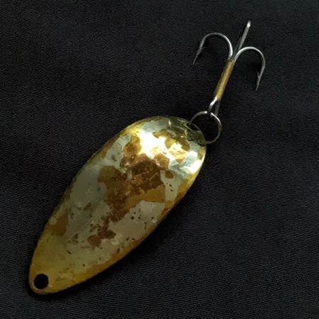 En rejäl vikt på 14 g (1/2 oz) ger detta skeddrag en distinkt känsla och är designat för att nå djupare vattenlager vid invevning. Detta exemplar från Seneca Lure Co. mäter 5,5 cm (2 1/4") och har den ikoniska 'Hula Girl'-stämpeln tillsammans med 'Wigl Lure'- och 'Little Cleo'-märkningen på baksidan. Denna specifika gravyr var ett kännetecken för den ursprungliga USA-produktionen innan Acme tog över varumärket på 1980-talet och så småningom tog bort dansösen från gjutformen. Nickel/brons-finishen på detta bete, med produktkod 22211, uppvisar tydligt slitage där nickelpläteringen har tunnats ut och exponerat basmetallen, vilket ger ett skickbetyg på 3/5. Det är fortfarande utrustat med en vass trekrok och en stark fjäderring, vilket bibehåller den hårdvarukonfiguration som föredras av samlare av originalbeten från Seneca.