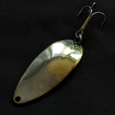 Detta klassiska skeddrag utmärks av sin iögonfallande tvåfärgade finish i nickel och mässing, kombinerat med en rejäl vikt på 18 g (2/3 oz). Betet är 5,5 cm (2 1/4") långt och detta exemplar, med produktkod 22214, är ett genuint stycke fiskehistoria från Seneca Lure Company. Det härstammar från tiden innan märket köptes upp av Acme i början av 1980-talet. Samlare värderar "Hula Girl"-varianten högt på grund av den ikoniska dansösen ingraverad på baksidan – en detalj som saknas på modernare versioner. Många erfarna sportfiskare hävdar än idag att just denna lilla gravyr var hemligheten bakom dragets legendariska framgångar. Hårdvaran är fortfarande fullt fungerande och består av en kraftig trekrok monterad med en robust fjäderring. Skicket bedöms till 3/5, där kroppen visar tydliga tecken på användning, men där ytbehandlingen i dubbelmetall fortfarande reflekterar ljuset effektivt. Detta USA-tillverkade skeddrag representerar originaldesignen av ett bete som förblir en stapelvara för öring- och laxfiskare.