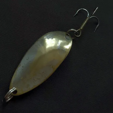 Mässings- och nickeltoner blandas över ytan på detta 5,5 cm (2 1/4") skeddrag, ett kännetecken för den ursprungliga Seneca-produktionen. Detta specifika exemplar, med produktkod 22288, har den legendariska stämplade dansösen på baksidan – en detalj som gav det smeknamnet "Hula Girl" bland erfarna sportfiskare. Många veteraner svär vid närvaron av denna dansös, som fasades ut efter att Acme förvärvade Seneca Lure i början av 1980-talet. Med en vikt på 18g (2/3oz) ger det kraftiga godset ordentlig massa för goda kastlängder. Stämplingen på baksidan visar tydligt texten "Wig-L-Lure" tillsammans med tillverkarinformation, vilket identifierar dess ursprung från den amerikanska tillverkningserans glansdagar. Vad gäller det fysiska skicket är draget i ett stabilt skick 3/5, med synligt slitage och en mattning av den ursprungliga pläteringen som vittnar om dess ålder. Fjäderringar och trekrok är intakta och sitter säkert monterade på kroppen.