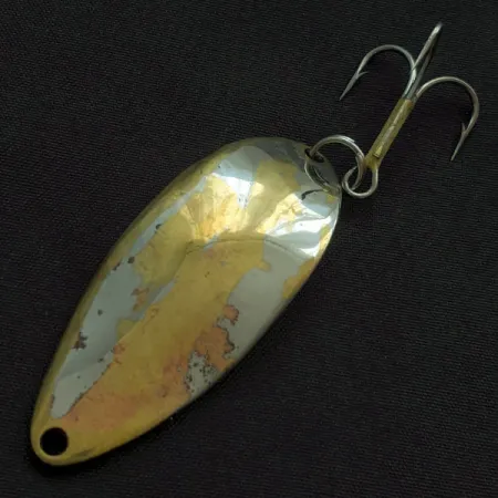 Med en vikt på 18 g (2/3 oz) är detta klassiska skeddrag ett stycke sportfiskehistoria från Seneca Lure Company. Baksidan är prydd med den legendariska "Hula Girl"-stämpeln tillsammans med texten "WIGL LURE", en detalj som togs ur produktion efter att Acme förvärvade varumärket på 1980-talet. Med en längd på 5,5 cm (2 1/4") uppvisar detta exemplar en distinkt trefärgad finish i nickel, mässing och koppar. Skicket är bedömt till 3/5 och visar den ärliga karaktären hos ett verktyg som har använts flitigt på sjön, där originalpläteringen nötts ner och blottat de varma metalltonerna under. För samlare av amerikanska fiskeredskap representerar denna specifika modell (produktkod 22427) eran innan designen förenklades. Komponenterna inkluderar en kraftig fjäderring och en trekrok, redo för både spinnfiske och trolling. Hålet i den smala änden ger en enkel och direkt fästpunkt för din lina eller tafs.