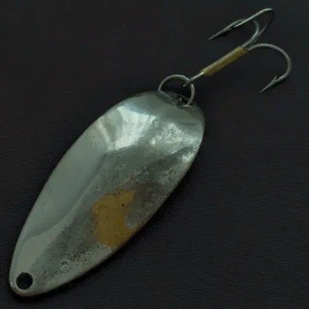 Detta skeddrag i nickelfinish har den ikoniska Hula Girl-dansaren instämplad på baksidan och är ett klassiskt hantverk från Seneca. Med en vikt på 18 g (2/3 oz) och en längd på 5,5 cm (2 1/4") är detta exemplar med produktkod 22442 försett med den berömda graverade figuren som samlare prioriterar högre än moderna Acme-nyutgåvor. Metallen uppvisar lätt ytslitage motsvarande skick 4/5, men behåller sin reflekterande yta för både spinnfiske och trolling. Konstruktionen innefattar en kraftig fjäderring och en trekrok med en liten hylsa på skaftet, vilket är typiskt för dessa tidiga amerikansktillverkade skeddrag. Förekomsten av dansarstämpeln fungerar som ett kännetecken för eran före varumärkesövergången i början av 1980-talet.
