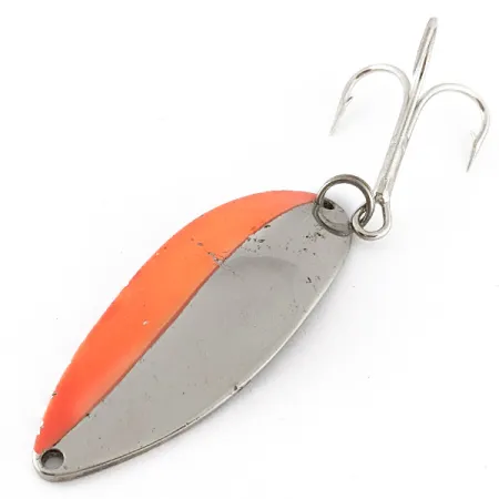 På baksidan finns den ikoniska "Hula Girl"-dansösen tydligt inpräglad, ett kännetecken för den ursprungliga Seneca-produktionen innan märket köptes upp av Acme i början av 1980-talet. Detta exemplar på 3/4 oz (21 g), med produktkod 22639, har den karaktäristiska färgkombinationen med hälften nickel och hälften orange. Skeddraget mäter 2 1/2 tum (6,5 cm) och är utrustat med en kraftig trekrok och fjäderring, vilket är typiskt för dess amerikanska arv. Medan moderna versioner av denna modell saknar dansösen, har detta vintage-exemplar kvar den grafik som många samlare anser definierar betets arv. Skicket är en stabil 4/5, med lätta ytspår på nickelpläteringen medan den orangea finishen är mycket livfull och intakt. Man kan tydligt se "SENECA" och viktangivelserna djupt inpräglade i metallen bredvid hula-dansösens siluett.