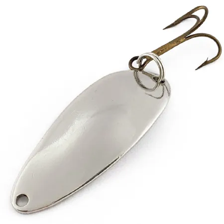 Den förnicklade ytan på detta 4,5 cm skeddrag ger en hög synlighet med kraftiga reflexer, vilket har gjort det till en klassiker i mångas draglådor. Den karaktäristiska 'Hula Girl'-logotypen och varumärket är tydligt stämplade i metallen – en tidstypisk detalj från Seneca-eran när de tillverkades i USA. Med en vikt på 10 g har betet en rejäl densitet som möjliggör både långa kast och kontrollerad trolling. Detta specifika exemplar, med produktkod 22885, är i skick 5/5 och har behållit sin blanka yta utan det slitage som ofta syns på äldre metalldrag. En vass trekrok i brons är säkert monterad med en kraftig fjäderring, redo för fiske. I nosen finns ett rent stansat linhål anpassat för direkt knut eller användning av beteslås.
