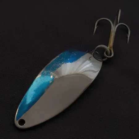 Kraftig blå färg över den polerade kromfinishen skiljer detta 14 g vintage skeddrag från senare massproducerade modeller. Med en längd på 5,5 cm har detta exemplar den ikoniska ”Hula Girl”-dansösen stansad i metallen på baksidan, ett signum för den ursprungliga tillverkningen från Seneca Lure Company. Denna specifika grafik är mycket eftertraktad av samlare, eftersom dansösen försvann från designen kort efter att Acme förvärvade Seneca i början av 1980-talet. Registrerat under produktkod 23049, håller draget ett imponerande skick på 5/5 med en blank och ren yta. Den kraftiga hårdvaran inkluderar en robust fjäderring och en vass trekrok, utformad för de långa kast som gjort denna profil till en stapelvara i draglådor under årtionden. Den djupa krompläteringen reflekterar ljus effektivt tillsammans med den fylliga blå accenten på dragets framsida.