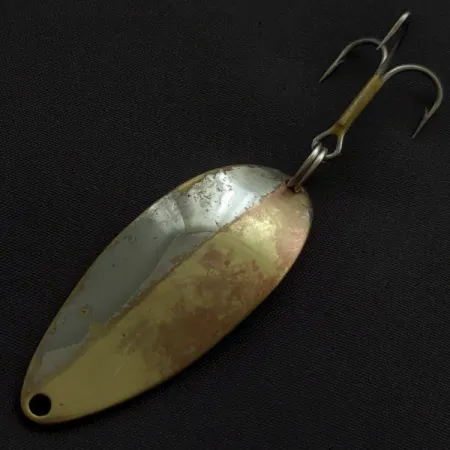 Den tvåfärgade finishen i guld och nickel ger detta skeddrag på 14 g (1/2 oz) ett distinkt blänk som samlare direkt känner igen som en klassiker. På baksidan finns en tydlig stämpel med märket "Little Cleo" tillsammans med namnet "Wig-L-Lure", vilket bekräftar dess ursprung hos Seneca Lure Company. En utmärkande detalj för detta exemplar, med produktkod 23320, är den ikoniska gravyren av en "Hula Girl" eller dansös på baksidan – en detalj som togs bort efter att Acme förvärvade Seneca i början av 1980-talet. Skeddraget mäter 5,5 cm (2 1/4") och har kvar sin ursprungliga plätering av hög kvalitet. Komponenterna består av en robust trekrok monterad med en fjäderring, försedd med en bit gul slang över skaftet. För många vintage-entusiaster är just närvaron av dansösen det som befäst dragets legendariska status i sportfiskevärlden. Detta specifika exemplar är oanvänt och i exceptionellt fint skick.