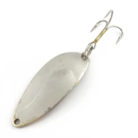 Baksidan är stämplad med den ikoniska "Hula Girl"-dansösen, och de nickel- och guldpläterade ytorna på detta skeddrag framhäver dess ursprung från Seneca Lure Company. Detta exemplar, identifierat med produktkod 23514, mäter 5,5 cm i längd och väger 14 g. Baksidan är graverad med "LITTLE CLEO" och "WIGL LURE", vilket markerar en produktionsepok innan Acme förenklade designen i början av 1980-talet. Många erfarna sportfiskare hävdar att den dansande figuren är hemligheten bakom dragets historiska framgångar. Utrustningen består av en klassisk fjäderring och trekrok. Med ett skick på 3 av 5 reflekterar den metalliska finishen hantverket hos tidiga USA-tillverkade fiskeredskap designade för spinnfiske och trolling.