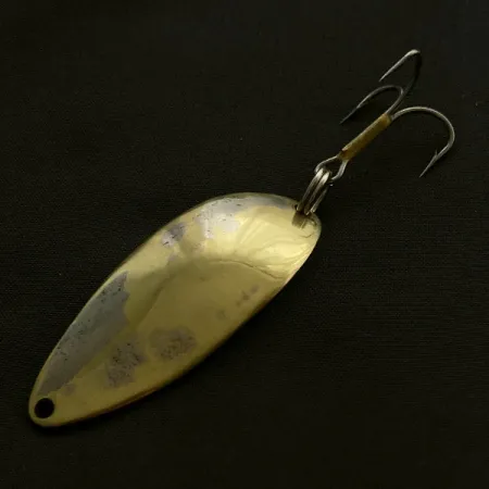 Guldplätering på en bas av nickel kännetecknar detta specifika 1/2 oz (14g) skeddrag. På den konkava sidan finns en tydlig stämpel av den legendariska "Hula Girl"-figuren tillsammans med texten "WIGL LURE", vilket identifierar detta som en äkta produkt från Seneca Lure Company. Denna version, med produktkod 23515, tillverkades före Acmes uppköp i början av 1980-talet, varefter dansarbilden togs bort från designen. Betet mäter 2 1/4" (5,5 cm) och har kvar sin originalmontering, inklusive en kraftig fjäderring och en trekrok säkrad med en mässingsfärgad hylsa. Med tanke på dess skick (3/5) finns det en synlig uttunning av guldpläteringen på den konvexa sidan, vilket blottar det silverfärgade nickelskiktet under, samtidigt som den strukturella integriteten är intakt. Gravyren av hulaflickan är fortfarande djup och väl definierad på bladets insida.