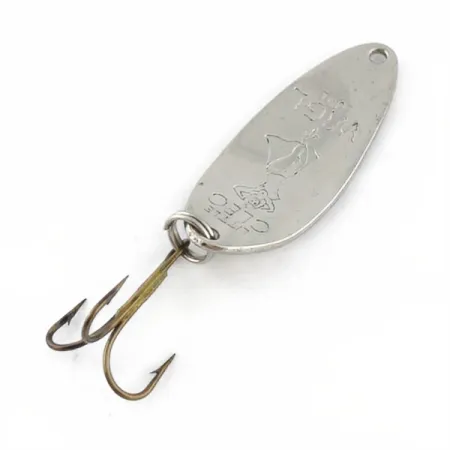 Den ikoniska silhuetten av den dansande Hula Girl är präglad direkt i nickelfinishen, ett kännetecken för den ursprungliga Seneca-produktionen innan märket förvärvades av Acme i början av 1980-talet. Detta skeddrag, som väger 10 g (1/3 oz) och mäter 4,5 cm (1 3/4"), har den klassiska blanka pläteringen som har bevarats i utmärkt skick, vilket ger det betyget 5/5. Även om moderna versioner av detta drag saknar den ingraverade dansösen, svär många erfarna samlare och sportfiskare fortfarande vid den ursprungliga Seneca-designen på grund av dess historiska tyngd och specifika silhuett. Den kraftiga trekroken är säkert fäst med en fjäderring, och i dragets ovandel finns det standardiserade hålet för lininfästning. Det är enkelt att identifiera detta specifika exemplar för din samling via produktkod 23665, vilket markerar det som ett genuint stycke amerikansk fiskehistoria. Skeddraget fulländas med en tydlig stämpling av namnet Little Cleo bredvid dansösfiguren.