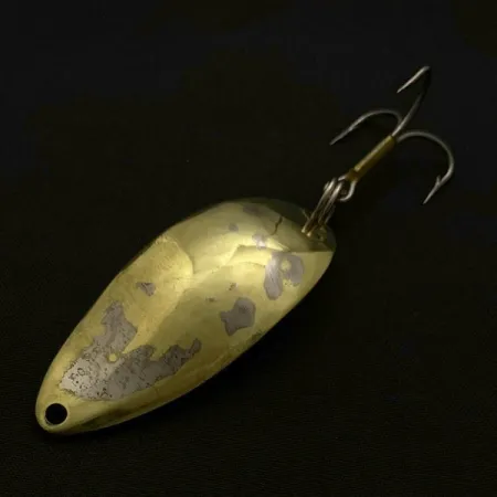 Guldpläteringen, som präglas av spridda slitagemärken, identifierar detta 14 g (1/2 oz) skeddrag som ett genuint stycke amerikanskt fiskearv. Med en längd på 5,5 cm (2 1/4") bär denna Little Cleo (Hula Girl) den ursprungliga stämpeln från Seneca Lure Company, vilket skiljer den från senare Acme-produktioner. Samlare värdesätter denna specifika modell, produktkod 23740, för den ikoniska dansarsilhuetten – en detalj som många erfarna sportfiskare svär är hemligheten bakom dess legendariska status vid fiske efter öring och lax. Guldfinishen uppvisar synligt slitage med skicket 3/5, där pläteringen har nötts bort och blottat den underliggande metallen i oregelbundna fläckar över den konvexa ytan. Utrustad med en kraftig trekrok och en pålitlig fjäderring, förblir hårdvaran robust och funktionell. Denna specifika version speglar designen från tiden före varumärkets uppköp i början av 1980-talet, och bevarar en visuell detalj som sedan dess har försvunnit från moderna produktionslinjer.