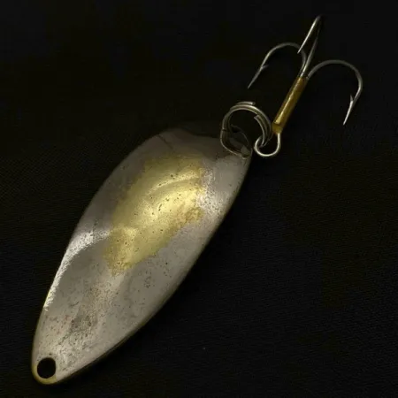 Ytor i nickel och guld blandas över framsidan på detta 14g (1/2 oz) skeddrag, vilket ger en tvåfärgad estetik som vintage-samlare direkt känner igen. Tillverkad av Seneca innan varumärket flyttade till Acme i början av 1980-talet, har baksidan av draget den ikoniska Hula Girl-stämpeln tillsammans med namnet Little Cleo. Många erfarna sportfiskare föredrar just denna version och tror att själva graveringen av dansaren gav en gnutta tur till presentationen. Metallkroppen mäter 5,5 cm (2 1/4") och bär Wigg-L-Lure-markeringarna tydligt stämplade i ytan. Listad under produktkod 23841, inkluderar draget en trekrok och fjäderring. Skicket är 3/5, vilket speglar dess tid i vattnet och visar det ärliga slitaget från ett redskap som har kastats och vevats in.