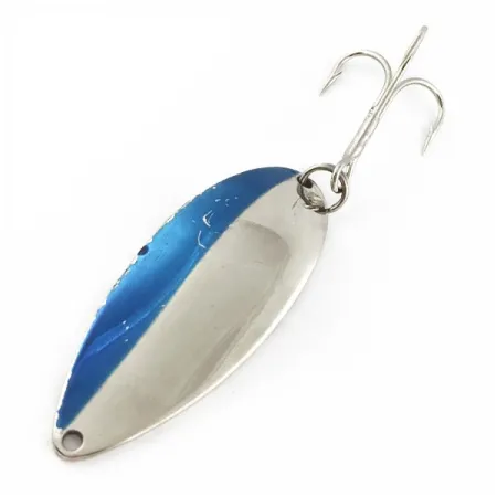 Med en vikt på 21 g (3/4 oz) är detta skeddrag en betydande del av amerikansk fiskehistoria. Framsidan av bladet har en ren nickelfinish med en klar blå färgstrimma längs ena kanten. På baksidan finns den ikoniska "Hula Girl"-dansösen djupt instämplad i metallen, ett kännetecken för den ursprungliga Seneca-produktionen innan märket köptes upp av Acme i början av 1980-talet. Samlare söker ofta efter dessa Seneca-tillverkade Little Cleos specifikt för dansöslogotypen, som saknas på moderna versioner. Detta exemplar, med produktkod 24050, mäter 6,5 cm (2 1/2") och är i skick 5/5, vilket innebär att det är mycket välbevarat. Baksidan har också det stämplade Seneca-namnet och "Made in USA", tillsammans med en pålitlig trekrok och fjäderring.