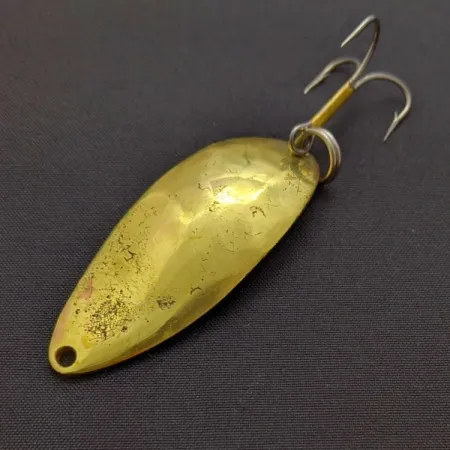 Guldpläteringen fångar direkt blicken på detta skeddrag på 14 g (1/2 oz), som uppvisar den klassiska droppformade profil som tjänat sportfiskare i årtionden. Skicket är bedömt till 3 av 5, och metallytan har ett patinerat utseende med visst ytslitage som vittnar om dess historia vid vattnet, men den förblir solid och redo för antingen samlingen eller ett kast. Vänd på den 5,5 cm (2 1/4") långa kroppen så hittar du den ikoniska "Hula Girl"-dansösen stämplad i metallen – ett kännetecken för originalproduktionen från Seneca innan märket övergick till Acme i början av 1980-talet. Många erfarna fiskare svär vid just denna version, listad med produktkod 24090, och är övertygade om att dansösen är hemligheten bakom dess legendariska effektivitet. Komponenterna består av en kraftig trekrok fäst med en robust fjäderring, vilket säkerställer att draget håller ihop vid hugg från aggressiva rovfiskar. Detta exemplar är stolt stämplat som tillverkat i USA och representerar en tid då betestillverkning fokuserade på intrikata detaljer som moderna versioner ofta saknar.