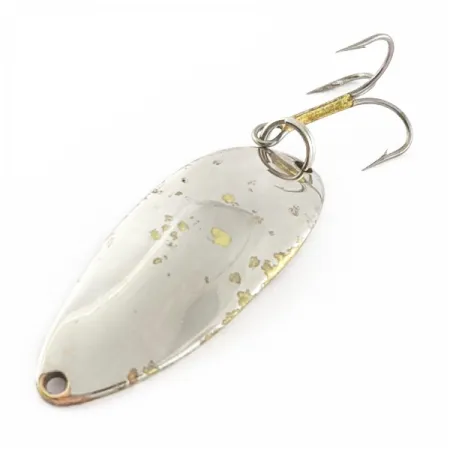 Med en längd på 5,5 cm (2 1/4") representerar detta skeddrag en klassisk del av amerikansk sportfiskehistoria från företaget Seneca Lure. Med sina 14 g (1/2 oz) är det ett rejält kastdrag i en kontrasterande färgkombination av nickel och mässing. Detta specifika exemplar, identifierat med produktkod 24102, uppvisar tydliga spår av användning som är naturliga för ett vintage-redskap, vilket ger det ett skickbetyg på 3/5. Den mest utmärkande egenskapen för denna modell är ”Hula Girl”-dansösen som är stämplad på baksidan. Samlare söker ofta efter just dessa originalversioner från Seneca eftersom den ikoniska dansösen togs bort från designen efter att Acme förvärvade företaget i början av 1980-talet. Många erfarna sportfiskare hävdar bestämt att framgången med Little Cleo (Hula Girl) var direkt kopplad till närvaron av den stämplade figuren på metallytan.
