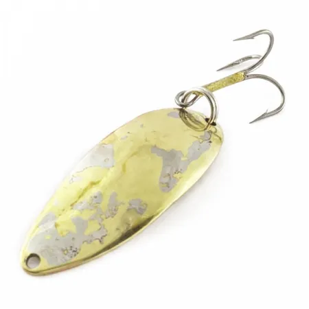 Denna klassiker från Seneca har en droppformad profil med mässingsfinish och var ett givet inslag hos örings- och laxfiskare under mitten av 1900-talet. Draget mäter 5,5 cm (2 1/4") och väger 14 g (1/2 oz), och just detta exemplar bär produktkod 24103. På baksidan av skeden finns den graverade danserskan som gav draget smeknamnet "Hula Girl" innan Seneca köptes upp av Acme i början av 1980-talet. Senare versioner av Cleo saknade denna grafik, vilket många erfarna sportfiskare anser var hemligheten bakom originalets framgång. Silverfärg lyser igenom mässingspläteringen på den konvexa sidan, vilket ger metallen ett autentiskt, välanvänt utseende. Skicket bedöms till 3/5. En kraftig fjäderring håller originaltrekroken på plats vid den stansade metallkroppens bakände.