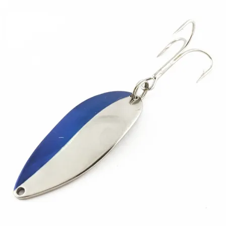 Med en vikt på 21 g (3/4 oz) har detta exemplar den gedigna känslan av ett kraftigt skeddrag för kastfiske. Ytan i nickel och blått är anmärkningsvärt ren och uppvisar den högkvalitativa plätering som var typisk för Seneca Lure Companys tillverkning innan de köptes upp av Acme i början av 1980-talet. Vänder man på den 6,5 cm (2 1/2") långa kroppen syns den karakteristiska "Hula Girl"-stämpeln på baksidan, en detalj som många erfarna samlare anser gav Little Cleo dess legendariska rykte. Denna specifika modell, identifierad med produktkod 24198, har kvar sin originalmontering inklusive den robusta trekroken och fjäderringen. Stämpeldetaljen är ett kännetecken för dessa tidiga USA-tillverkade drag, då moderna versioner producerade av Acme inte längre har den dansande figuren. Att hitta ett exemplar i skick 5/5 som detta är en höjdpunkt för dem som uppskattar övergångsåren i amerikansk sportfisketillverkning. Den blå färgen täcker halva den konvexa sidan, vilket skapar en skarp kontrast mot den polerade nickelytan.