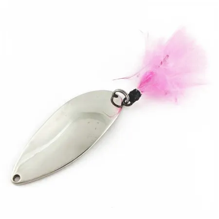 Med en vikt på rejäla 21 g (3/4 oz) är denna Seneca-tillverkade klassiker ett utmärkt exempel på den ursprungliga Little Cleo-designen, tillverkad före Acmes övertagande i början av 1980-talet. Den nickelfinishade kroppen mäter 6,5 cm (2 1/2") och pryds av den legendariska "Hula Girl"-siluetten stämplad på baksidan. Exemplaret, som har produktkod 24270, är i skick 5/5 med en blank, ren yta och välskötta komponenter. En färgstark rosa fjäderdräkt är fäst i den bakre fjäderringen, vilket ger en mjuk texturkontrast mot den hårda metallkroppen. Denna specifika modell speglar den era då Seneca tillverkade dessa drag med den karaktäristiska dansarstämpeln, en detalj som många sportfiskare anser bidrog till dess status som ett givet val för tungt spinnfiske. Framtill finns ett precisionsstansat hål för en säker anslutning till tafs eller beteslås.