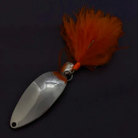 Lysande orange fjädrar pryder trekroken på detta exemplar och ger en skarp kontrast till den polerade metallkroppen. Detta Seneca-tillverkade Little Cleo (Hula Girl) väger 1/2 oz (14 g) och mäter 2 1/4" (5,5 cm) i längd. På den konkava sidan är den legendariska dansösen tydligt stämplad – ett signum för den ursprungliga Seneca Lure-eran innan Acme förvärvade varumärket på 1980-talet och tog bort figuren från designen. Även om produktposten för kod 24349 anger färgen som nickel/blå, har just detta exemplar en högpolerad nickelfinish med en tydlig orange färgaccent nära den övre öglan. Erfarna sportfiskare tillskriver ofta Cleos historiska framgång just denna gravyr, vilket gör dessa Seneca-versioner högt eftertraktade av samlare. Hårdvaran är i skick 5/5.