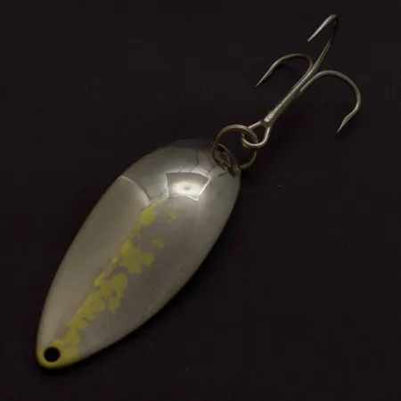 En tydlig viktmärkning på 3/4 oz (21 g) är präglad på baksidan av detta Seneca-tillverkade skeddrag, placerad intill den ikoniska 'Hula Girl'-figuren som definierar den tidiga eran för Little Cleo. Med en längd på 6,5 cm (2 1/2") har ytan i Nickel/guld en polerad kromad framsida med inslag av ett mönster i guldblad. Detta specifika exemplar, med produktkod 24360, representerar den ursprungliga visionen från Charlie Clark, låtskrivaren från New York som grundade Seneca Tackle 1951. Baksidan visar den detaljerade gravyren av dansösen 'Cleo', vars svängande rörelser Clark ville efterlikna för att locka fisk. Efter att Acme slutade använda bilden av dansösen när de förvärvade Seneca i början av 1980-talet, har dessa stämplade versioner blivit högt värderade av de som uppskattar dragets historiska rötter. En kraftig fjäderring kopplar samman trekroken av originalmodell med draget. I nuvarande skick 4/5 behåller metallen sin lyster och präglingen är fortfarande tydlig och läsbar över den välvda ytan.