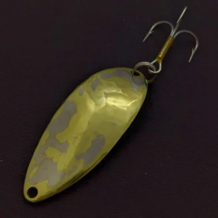 På baksidan av detta 14 g (1/2 oz) tunga skeddrag finns den tydliga stämpeln av en exotisk dansös, signumet för en originalproduktion från Seneca-eran. Detta specifika exemplar, med produktkod 24364, har den ikoniska tvåfärgade finishen i nickel/guld och den klassiska hamrade ytan på framsidan. Med en längd på 5,5 cm (2 1/4") är den droppformade kroppen utrustad med en kraftig trekrok fäst via en standard fjäderring. Den historiska gravyren av 'Hula Girl' inspirerades av Senecas grundare Charlie Clarks fascination för en dansares rörelser, ett designelement som fasades ut efter att Acme förvärvade företaget på 1980-talet. Dess tunga metallkonstruktion är speciellt framtagen för kast i djupare vattenlager där den tvåfärgade finishen ger högkontrasterande ljusreflektioner. Ytorna uppvisar en välbevarad finish med viss synlig ålder, vilket ger detta exemplar ett skickbetyg på 4/5. Den autentiska 'Wig-L-Lure'-texten är fortfarande läsbar nära linögat, vilket bekräftar dess ursprung från tillverkningen i New York.