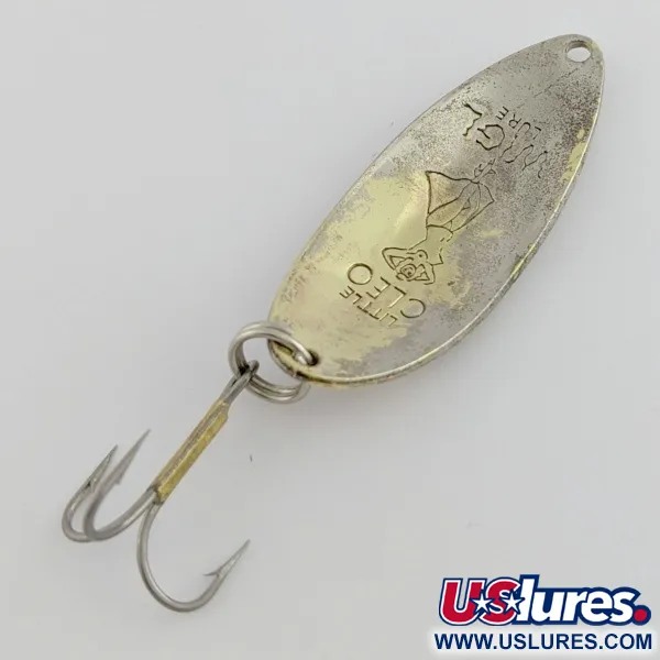 Präglingen av den ikoniska "Hula Girl"-figuren på baksidan identifierar omedelbart detta skeddrag på 14 g (1/2 oz) som en klassisk Little Cleo från den ursprungliga Seneca-eran. Med en längd på 5,5 cm (2 1/4") har detta exemplar en tvåfärgad finish i nickel och mässing som visar den ärliga karaktären hos ett välanvänt drag, vilket ger det ett skickbetyg på 3/5. Innan förvärvet av Acme Tackle i början av 1980-talet tillverkade Seneca Tackle Company från New York dessa drag med den detaljerade dansösgravyren – ett tillägg inspirerat av en exotisk dansös som låtskrivaren C.V. "Charlie" Clark såg på 1930-talet. Många veteranfiskare svär fortfarande på att dansöslogotypen är en turberlock för öring och lax i de stora sjöarna. Detta specifika bete, identifierat med produktkod 24443, har den klassiska kraftiga maskinvaran och en trekrok säkrad med en stark fjäderring. Mässingsmetallen tittar fram genom nickelpläteringen på den konvexa sidan, vilket ger en tydlig visuell kontrast som skiljer sig från moderna nyutgåvor.
