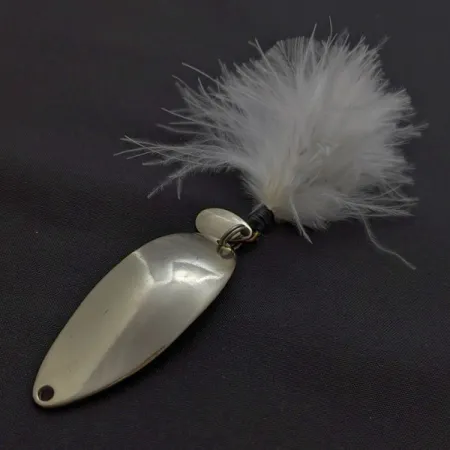 14 g stansad metall ger detta förnicklade skeddrag en rejäl tyngd för långa kast. På baksidan finns den ikoniska silhuetten av en „Hula Girl”-dansös, ett kännetecken för den ursprungliga Seneca Lure-produktionen innan märket köptes upp av Acme i början av 1980-talet. Många sportfiskare tror att denna logotyp är hemligheten bakom den tur som förknippas med originalmodellen. Den blanka nickelfinishen ger hög synlighet under olika vattenförhållanden. Skeddraget är 5,5 cm långt och har en tydlig puckelprofil samt en vitfjädrad trekrok som tillför ett subtilt pulserande visuellt element. Betyg 5/5, metallytan är exceptionellt ren och reflekterande med skarpa och tydliga originalstämplar. Detta exemplar med produktkod 24509 tillhör eran före Acme.