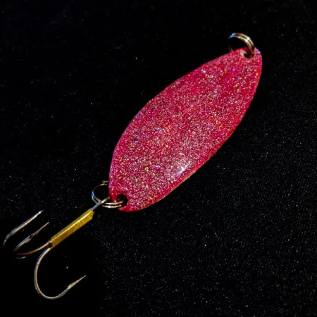 Rosa glitterbeläggning täcker den konvexa sidan av detta 14 g (1/2 oz) skeddrag, vilket ger ett texturerat blänk i vattnet. På baksidan finns den klassiska "Hula Girl"-dansösen stämplad i nickelpläteringen tillsammans med Seneca Lure-logotypen. Dessa originalversioner från Seneca är eftertraktade av dem som ser dansös-logotypen som en lyckobringare. Med en längd på 5,5 cm (2 1/4") är den distinkta, puckelryggiga formen konstruerad för stabilitet vid både kast och trolling. Detta specifika drag är i 4/5-skick och visar visst ytslitage som är naturligt för dess ålder, medan den stämplade grafiken förblir tydligt läsbar. Efter uppköpet av Seneca i början av 1980-talet försvann hula-stämpeln så småningom från produktionen, vilket markerar detta som ett tidigt exemplar från Seneca-eran. Produktkod: 24623.
