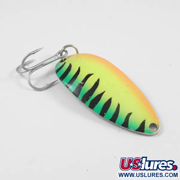 Kraftfulla Fire Tiger-nyanser i gult, grönt och orange täcker den konvexa sidan av detta skeddrag på 14 g (1/2 oz). Baksidan i polerat silver bär artikelkod 2540 och har den ikoniska "Hula Girl"-dansarstämpeln som definierade Seneca Lure Companys ursprungliga produktion. Med måtten 5,5 cm (2 1/4") behåller metallkroppen sin högblanka finish och tydliga prägling. Samlare söker ofta efter just denna version eftersom dansarlogotypen togs bort efter att Acme tog över varumärket i början av 1980-talet. Monteringen består av en robust fjäderring och en vass trekrok. Utan tecken på slitage bedöms skicket på detta exemplar som 5/5. De stämplade detaljerna på baksidan anger dess autentiska ursprung från USA, vilket bevarar en del av sportfiskehistorien från den tid då dessa drag först blev legendariska för spinnfiske och trolling.