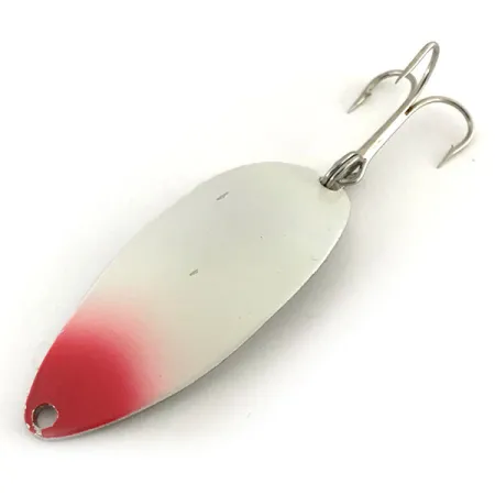 Detta äkta Seneca Little Cleo (Hula Girl) skeddrag väger 1/2 oz (14 g) och har den ikoniska stämplade bilden av den dansande flickan på sin förnicklade baksida. Detta specifika exemplar, katalogiserat under produktkod 8715, har en pärlemorvit finish med en tydlig röd nos på framsidan. Draget är 2 1/4" (5,5 cm) långt och representerar den ursprungliga produktionseran från det USA-baserade företaget Seneca Lure, före varumärkets förvärv av Acme i början av 1980-talet. Samlare jagar ofta efter dessa vintageversioner eftersom den karaktäristiska Hula Girl-gravyren togs bort i senare versioner. Konstruktionen består av en kraftig metallkropp utrustad med en robust fjäderring och en silverfärgad trekrok. Ytorna är anmärkningsvärt rena, vilket ger draget ett skickbetyg på 5/5 för den välbevarade färgen och den blanka nickelfinishen.
