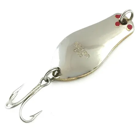 Polerad nickel täcker ena sidan av detta 3 cm (1 1/4") skeddrag, medan baksidan har en kontrasterande guldfärgad yta. Stansad med namnet "DOCTOR 245", har nickelsidan tre karakteristiska röda prickar nära linfästet. Med en vikt på exakt 5,5 g (3/16 oz) är detta USA-tillverkade drag från Prescott Spinner Company utrustat med sin originalkrok och fjäderringar. De metalliska ytorna på denna modell, med produktkod 6015, har behållit sin höga glans på båda färgsidorna. Det totala skicket för detta samlarobjekt bedöms till 5/5.
