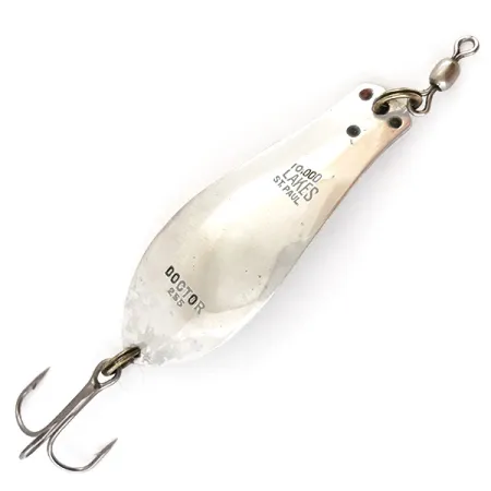 Förnicklingen på framsidan av detta skeddrag på 7 g (1/4 oz) är stämplad med märkningarna "10,000 LAKES ST. PAUL" och "DOCTOR 255", vilket identifierar det som en klassisk del av Minnesotas fiskehistoria. Tillverkad av Prescott Spinner under produktkod 4989, har Little Doctor 255 en tydlig kontrast mellan sin blanka nickelframsida och den varma guldtonade baksidan. Betet är 4,7 cm (1 3/4") långt och är utrustat med en robust trekrok och en lekare vid linögat. Detta specifika exemplar håller skicket 4/5 och visar subtila tecken på sitt vintageursprung men är anmärkningsvärt rent. Skeddragets droppform är en karaktäristisk design från det USA-baserade företaget, avsedd för mångsidigt spinnfiske.