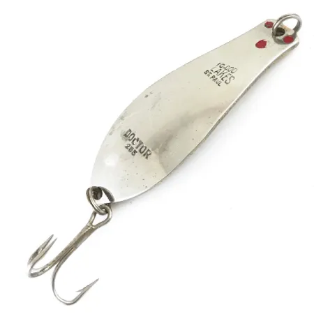 Stämplingen på den silverfärgade sidan lyder "DOCTOR 255" och "10,000 LAKES ST. PAUL", vilket markerar denna Prescott Spinner som ett stycke sportfiskehistoria från Minnesota. Betet mäter 4,7 cm (1 3/4") och har en kontrasterande finish med en polerad silverframsida och en slät guld baksida. Tre röda prickar är placerade nära linögat, vilket ger en klassisk visuell fokuspunkt på metallkroppen. Detta skeddrag på 7 g (1/4 oz), identifierat med produktkod 5360, är utrustat med sin originaltrekrok. Tillverkat i USA, är betet i 5/5-skick och bibehåller en hög nivå av lyster på båda pläterade ytor.