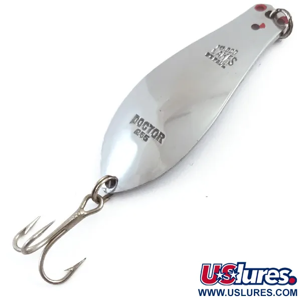 Polerad nickel täcker hela detta 4,7 cm (1 3/4") skeddrag, vilket återspeglar en klassisk estetik som uppskattas av sportfiskare som föredrar lätt utrustning. Modellnamnet "DOCTOR 255" är tydligt stämplat på framsidan tillsammans med "10,000 LAKES ST. PAUL", vilket identifierar dess ursprung i Minnesotas anrika fisketraditioner. Betet väger 7 g (1/4 oz) och har distinkta rödmålade detaljer nära den övre öglan, vilket ger en subtil visuell kontrast mot den blanka metallytan. Monteringen består av en robust trekrok säkrad med en fjäderring, vilket visar på exemplarets välbevarade skick med ett betyg på 5/5. Detta amerikansktillverkade skeddrag, listat under produktkod 5633, förblir en grundläggande design för spinnfiske eller trolling efter olika sötvattensarter.