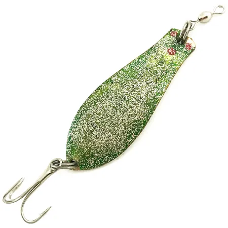 Golden Glitter och Green Glitter-finish täcker ytorna på detta 4,7 cm långa skeddrag i metall, ett kännetecken för varumärket Prescott Spinner. Little Doctor 255 väger 7 g och har en droppformad profil designad för spinnfiske eller trolling. En serie röda prickar är synliga nära huvudet på den gröna sidan, vilket fungerar som en huggpunkt för rovfiskar. Detta exemplar, med produktkod 5689, har kvar sin originalmontering inklusive en vass trekrok och ett toppmonterat lekande av tunntyp. Skicket är 5/5, med anmärkningsvärt välbevarade ytor och klara färger som förblir levande. Ursprungligen tillverkat i USA, visar detta drag de ytfinishar som var populära på amerikanska metalldrag under mitten av seklet, där glitter applicerades tätt för maximal synlighet under vatten. Fjäderringarna sitter tätt, vilket säkerställer att hårdvaran förblir säker.
